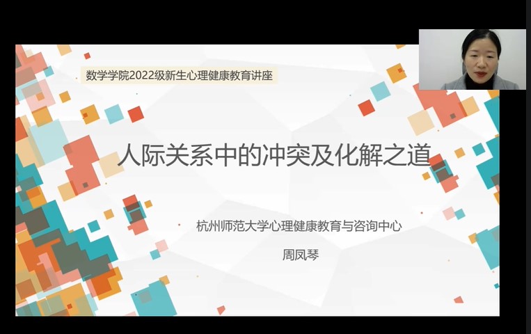 为扎实做好新生心理健康教育,帮助学生提高心理自助能力,能够以积极向上的精神面貌面对大学生活,12月7日下午,老虎机 邀请国家二级心理咨询师、北京师范大学教育学硕士、东方明见“领鹰计划”督导师、专职心理咨询师周凤琴老师为大一新生带来心理健康教育讲座。讲座采取线上直播方式,2022级全体新生参加讲座。