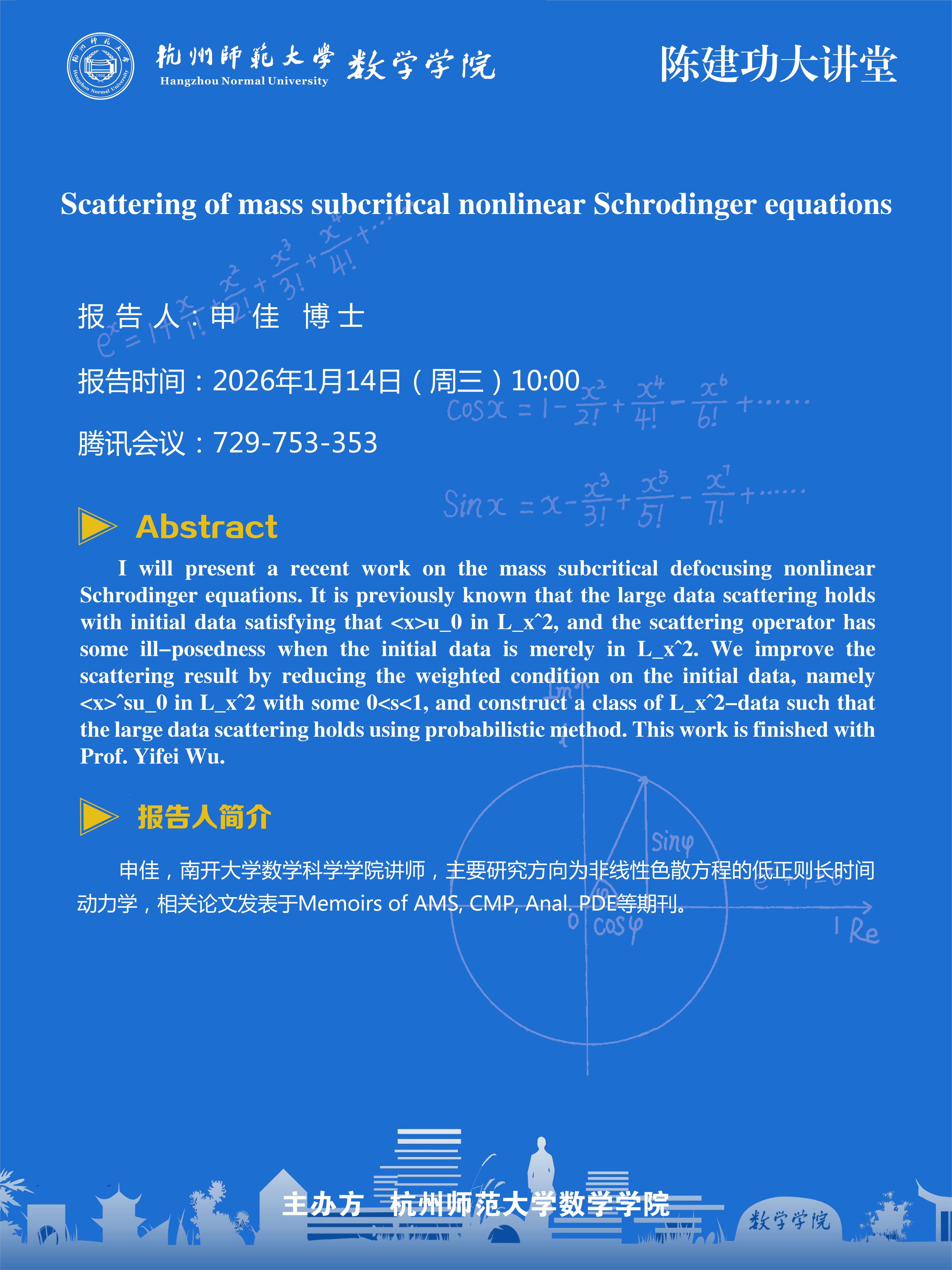 陈建功大讲堂(2026-4):Scattering of mass subcritical nonlinear Schrodinger equations